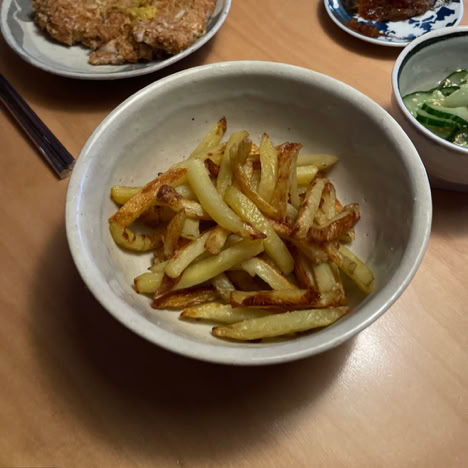 Hähnchen Katsu, Pommes, Gurkensalat und Daikon
