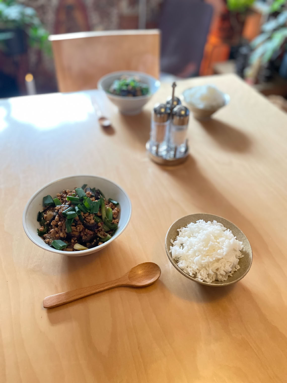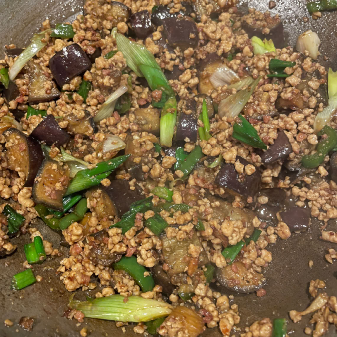 Schweinefleisch mit Ingwer, Frühlingszwiebeln und Auberginen