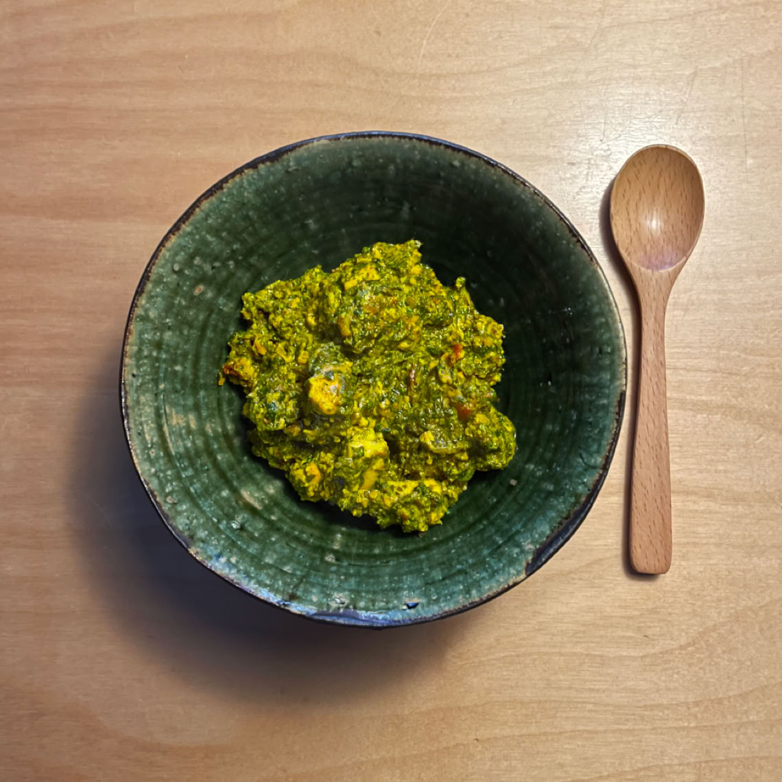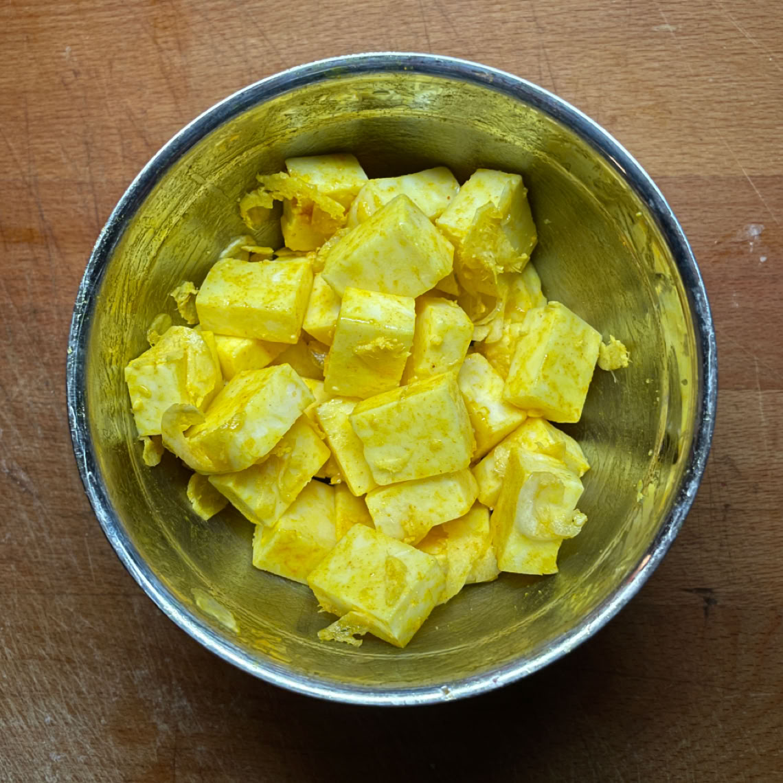 Sri Lankan mustard potato curry with apple and onion salad, homemade mango chutney and pickled radish