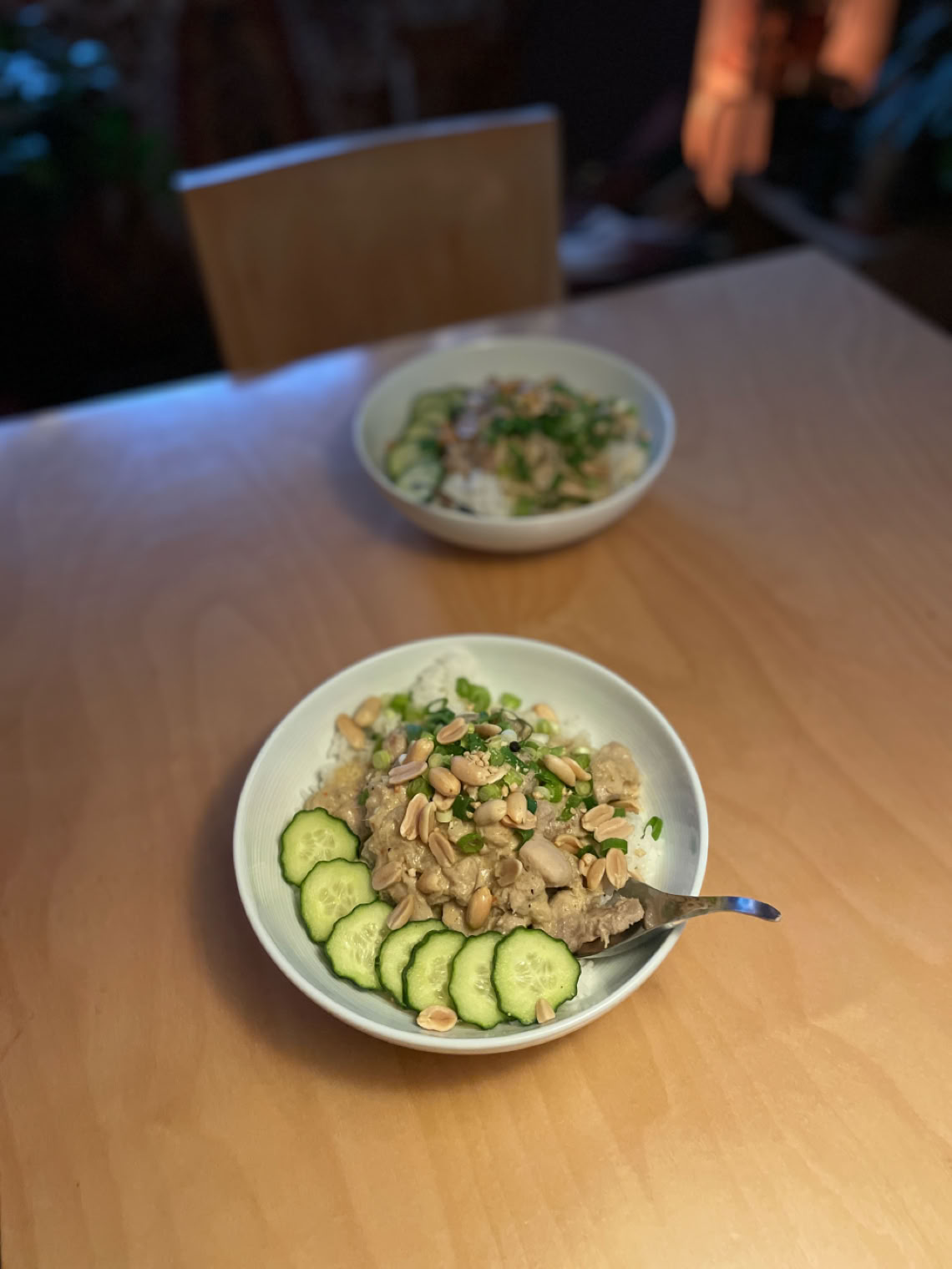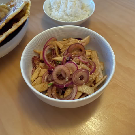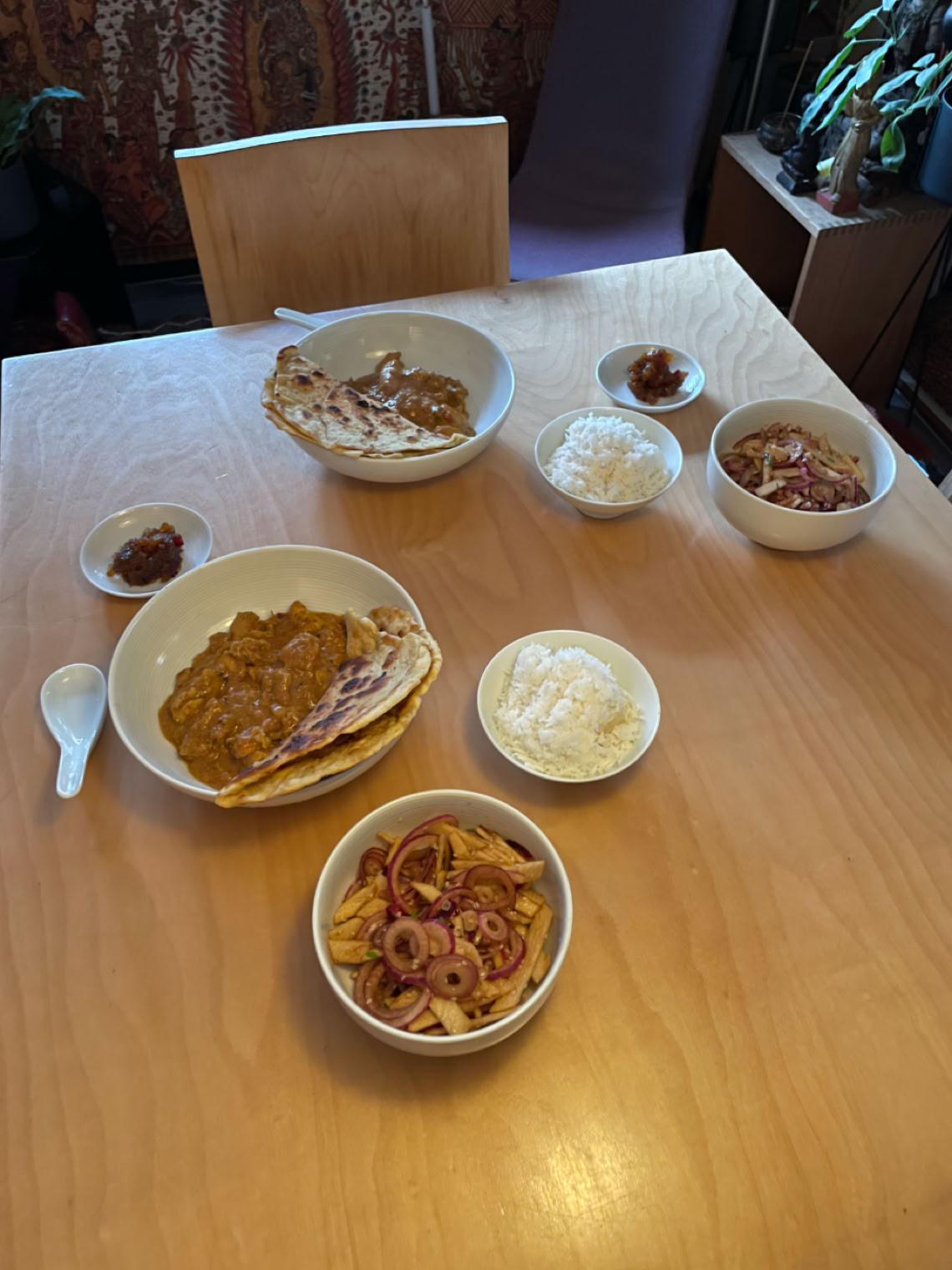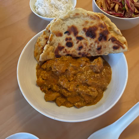 Chicken handi, apple and onion salad, and flatbread